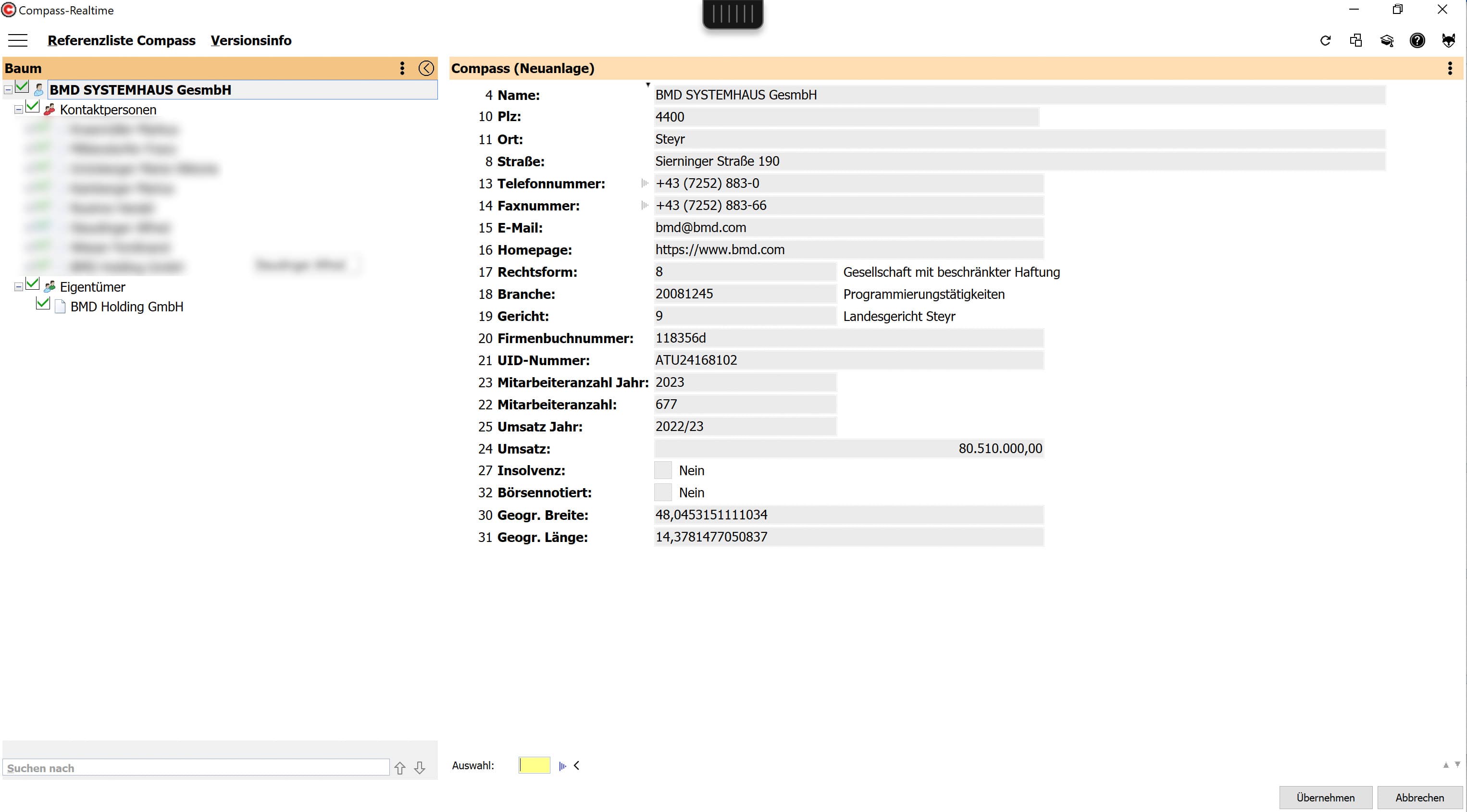 Dank des Compass-Monitorings bleiben Stammdaten jederzeit aktuell und lassen sich z. B. bequem in der BMD Buchhaltung oder im Rahmen des Jahresabschlusses weiterverarbeiten. Änderungen an Personendaten werden automatisch erkannt und über das BMD CRM als digitale Aufgabe an den zuständigen Mitarbeitenden gemeldet. So haben Unternehmen und Kanzleien die Gewissheit, dass wichtige Updates nicht unbemerkt bleiben. Nicht zuletzt ermöglicht Compass Realtime den Abruf von Firmenbuch- und Grundbuchauszügen direkt in Ihrer BMD Software als praktische Lösung für alle, die regelmäßig auf diese Dokumente zugreifen müssen.
