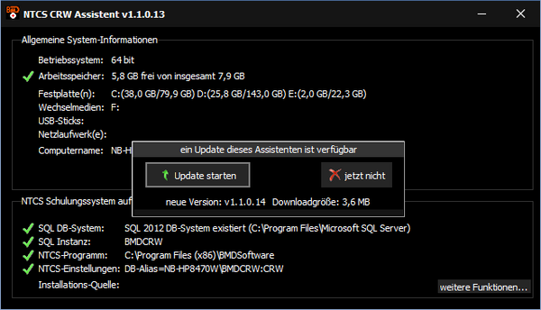 Der CRW Assistent wird permanent weiterentwickelt. Sollte ein noch nicht gelöstes Problem beim Start der NTCS auftauchen, obwohl Sie den Assistenten zu einem früheren Zeitpunkt bereits ausprobiert haben, macht es sich bezahlt, es noch einmal zu versuchen, da der Assistent kontinuierlich schlauer wird.