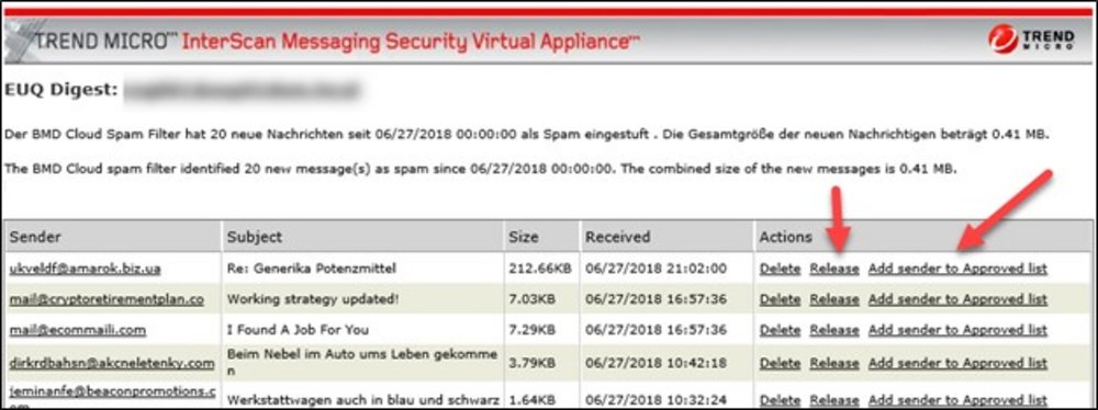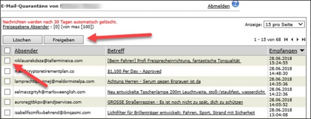Professional Kunden erhalten täglich einen Report via Mail mit gefilterten E-Mails. Absender können so über den Link in der E-Mail wieder freigegeben werden.