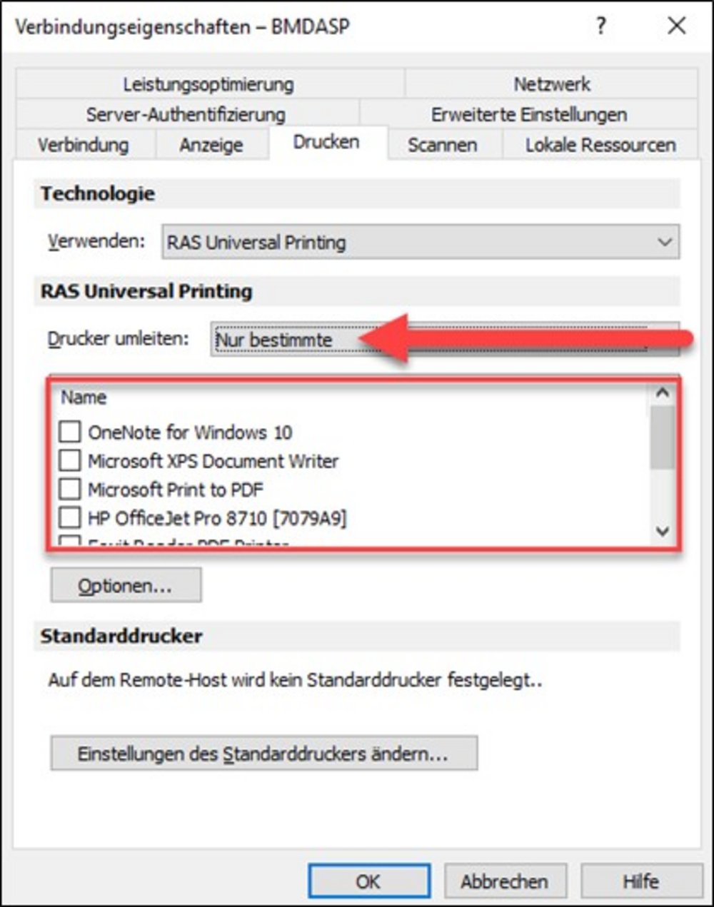In weiterer Folge ist dann der Reiter Drucker verfügbar und es können mehrere Geräte in die BMD Cloud-Sitzung mitgenommen werden. Es sollte im Normalfall die Option RAS Universal Printing verwendet werden.