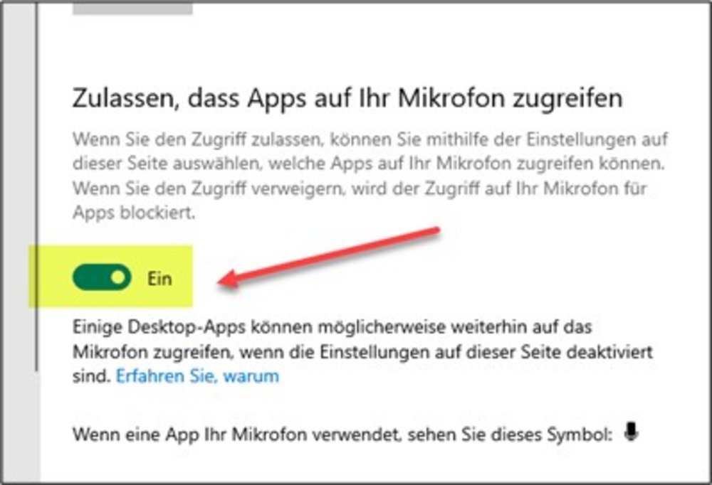 Hier finden Sie den Unterpunkt Zulassen, dass Apps auf Ihr Mikrofon zugreifen. Dieser muss auf Ein gesetzt werden. Eine Möglichkeit, diese Einstellung zu testen (aus der BMD Cloud-Umgebung), finden Sie unter folgendem Link: https://de.mictests.com/