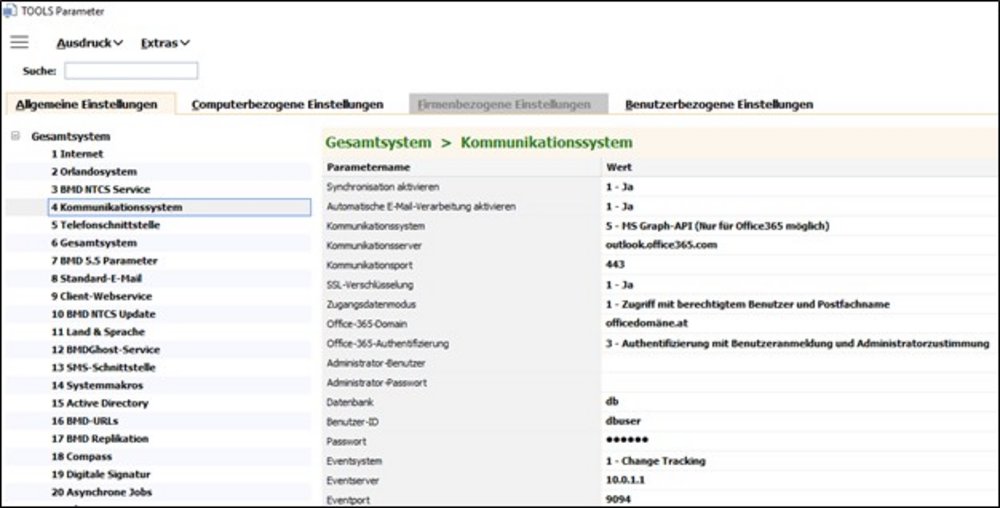 Bei dieser Parametereinstellung müssen Sie die Zugangsdaten für die Synchronisation in diesen beiden Parametern hinterlegen. Diese Parameter finden Sie unter TOOLS → Tools → Einstellungen → TOOLS Parameter → Gesamtsystem → Kommunikationssystem.