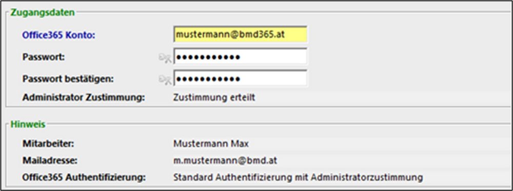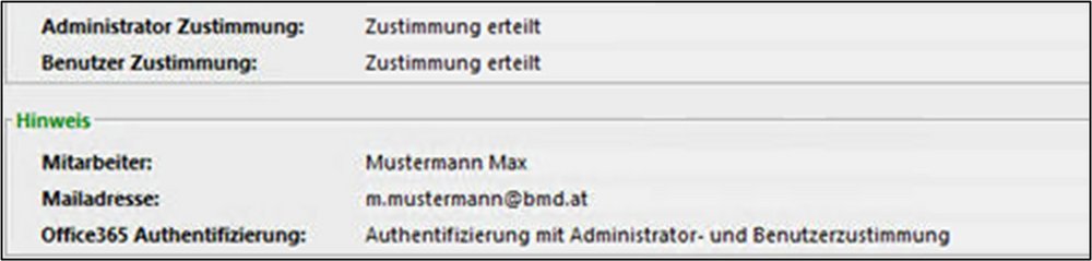 E-Mail-Adresse) auch die im Parameter gewählte Microsoft-365-Authentifizierungmethode angezeigt.