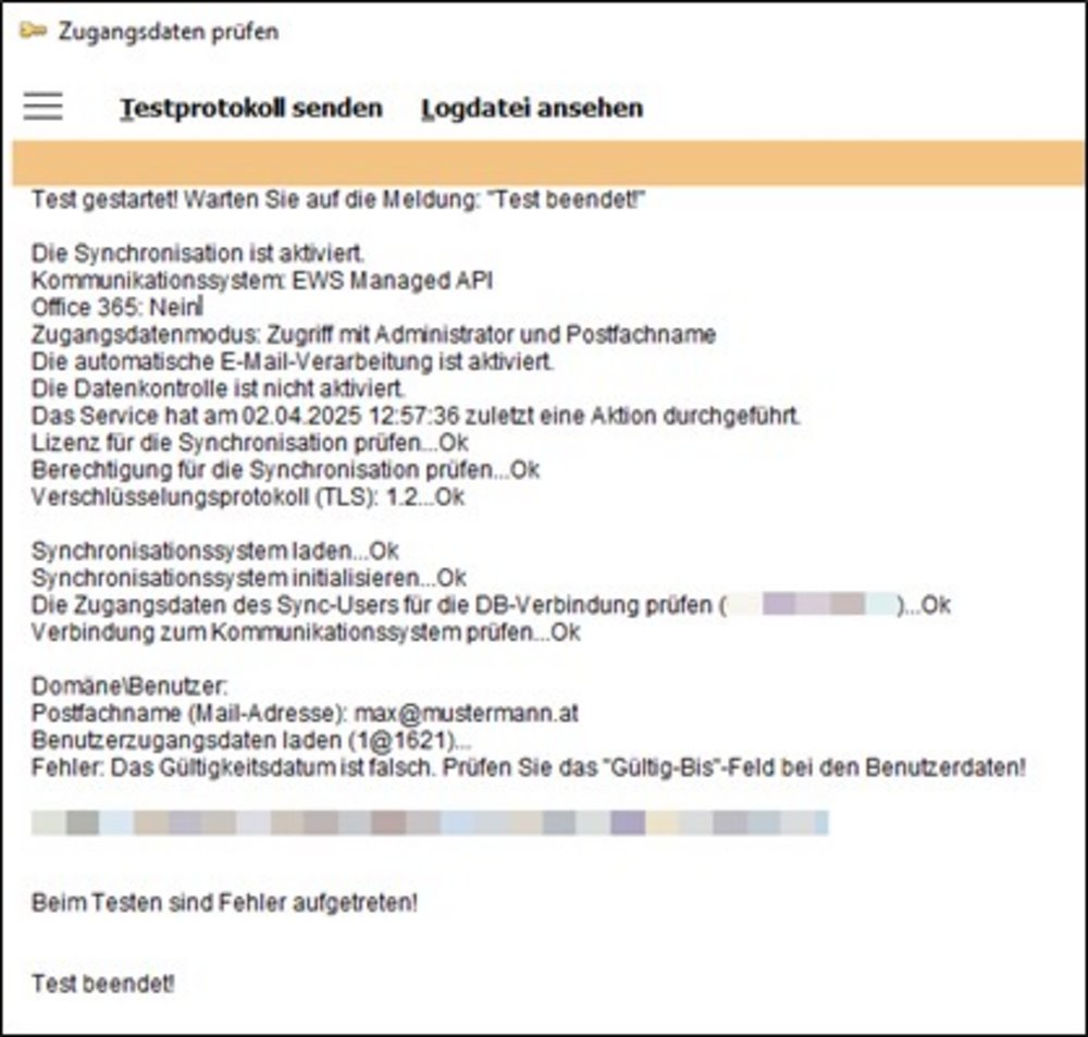1. Durchführen des Zugangsdatentests und Kontrolle des Protokolls. Hier können Rückschlüsse auf fehlerhafte Benutzerzugangsdaten bzw. Zugangsdaten des Benutzers für die Synchronisation gezogen werden.