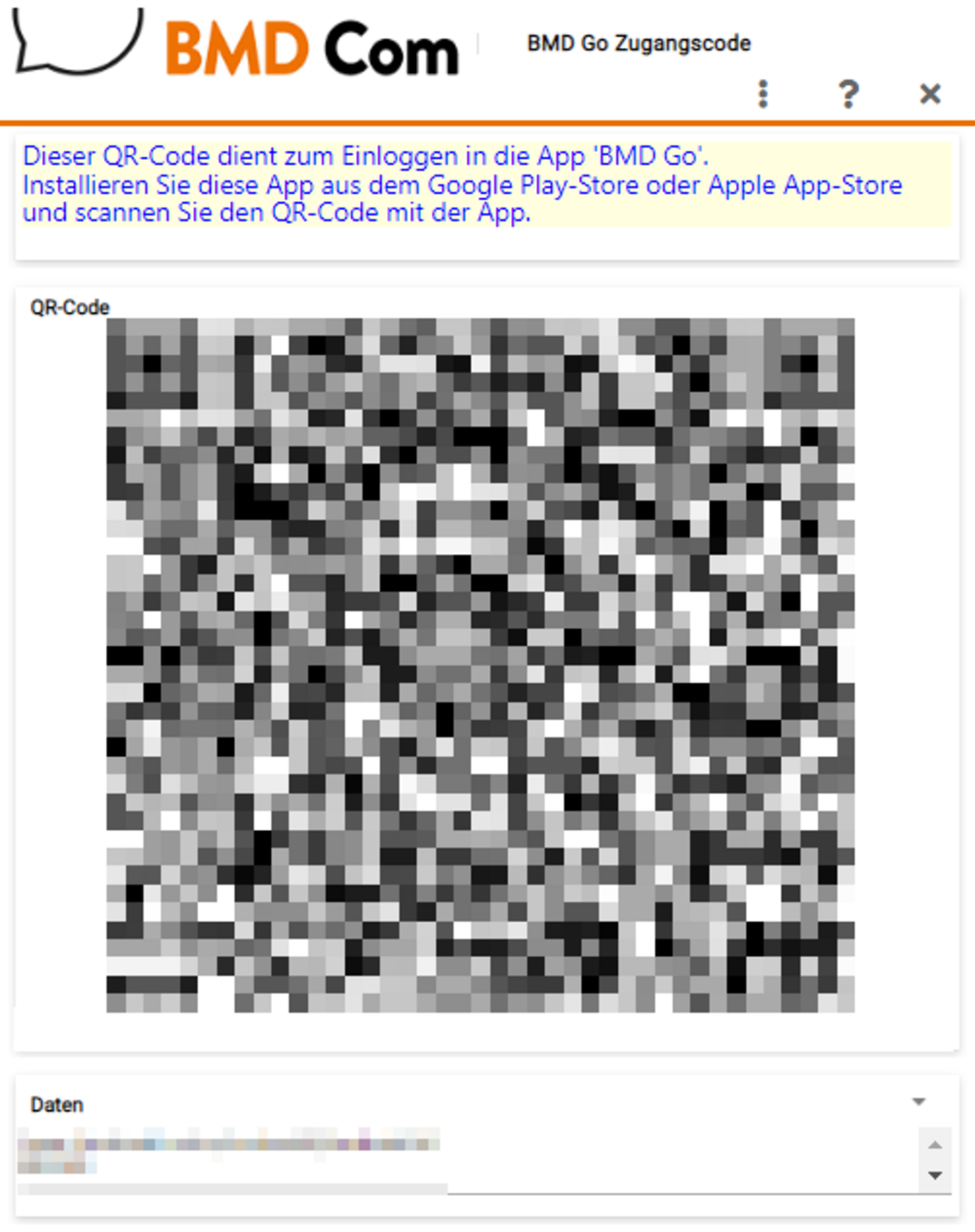 Das Fenster „BMD Go Zugangscode“ beinhaltet den zu scannenden QR-Code: