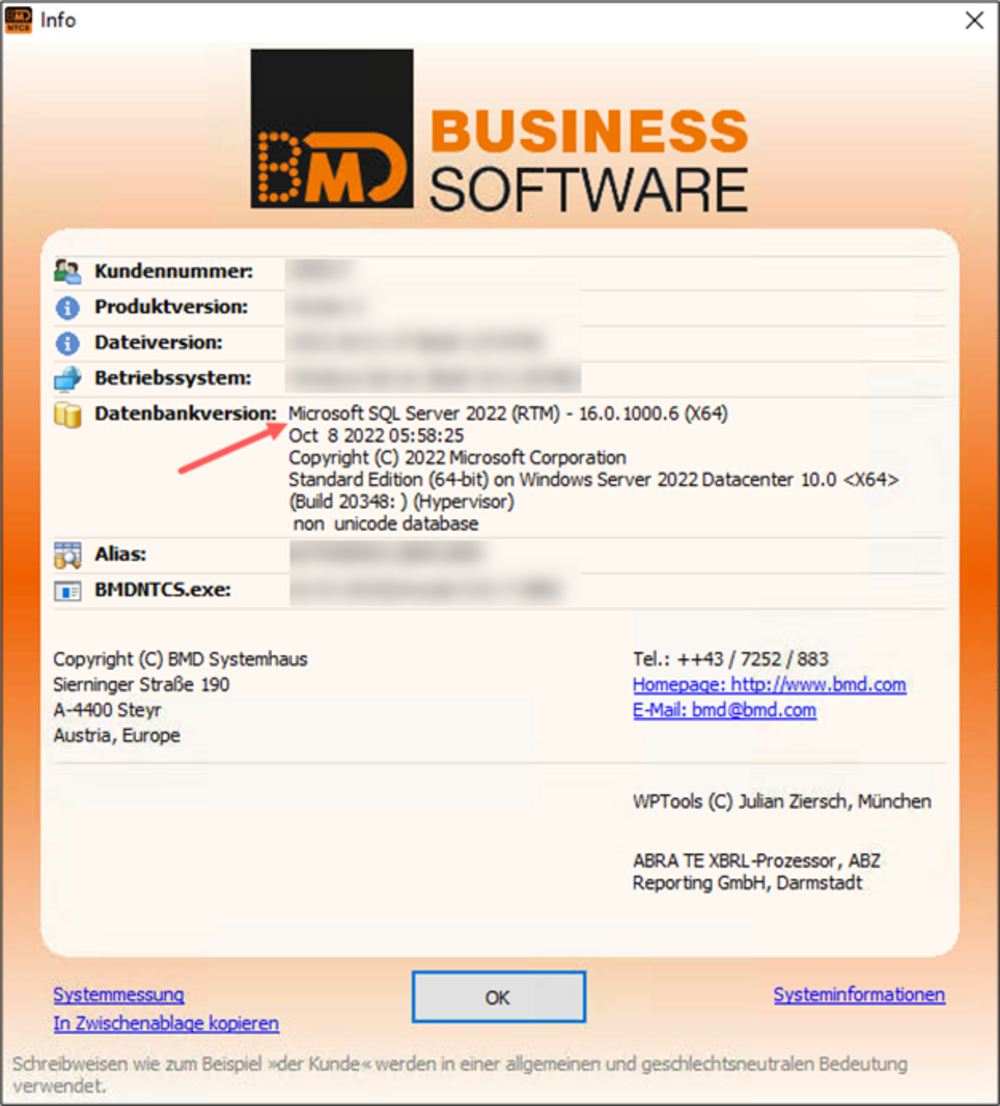 Start the BMD NTCS software after the update and check under “?†→ “Info†which SQL Server version is used. It should now be “SQL Server 2022â€.