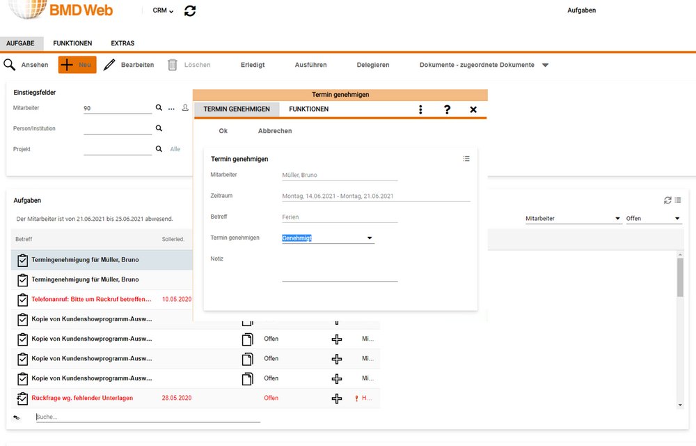 Vorgesetzte genehmigen Urlaubsanträge direkt in der Software oder auch unterwegs über die BMD Mobile App . Das kann ein einstufiger oder ein mehrstufiger Bearbeitungsprozess sein. Er sorgt dafür, dass der Urlaubsantrag an ein oder mehrere Vorgesetzte oder eine zentrale Stelle weitergeleitet wird. Abteilungsleiter, Teamleiter oder das Sekretariat können Urlaubsanträge schnell und einfach genehmigen und haben jederzeit den vollen Einblick in die Urlaubskonten und Zeitkonten der Mitarbeiter. Mit der digitalen Genehmigung gehen keine Urlaubsanträge mehr verloren.